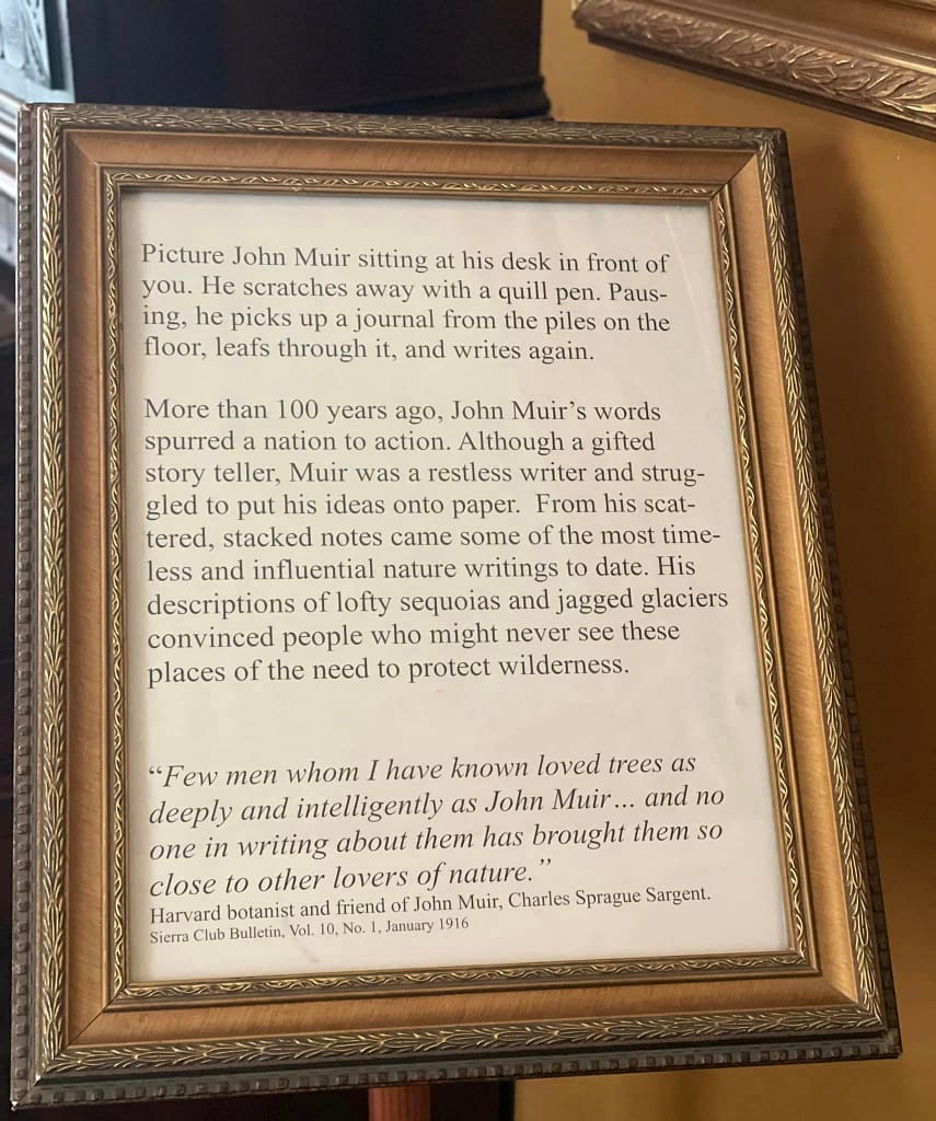 The Historic site is open 7 days a week, 10 AM – 5 PM (except Thanksgiving Day, Christmas Day, and New Year’s Day) and the Entrance and parking are FREE. The Old Victorian house is a beautiful museum full of history and some of Muir’s family’s cherished belongings, personal writings, and drawings. The grounds are lovely and beckon you for a stroll. There are various spots to picnic (but beware yellowjackets do pester you for your food here.) They allow for special events such as weddings with a reservation and permit. This site also operates Mount Wanda for some hiking and Ranger-led events.